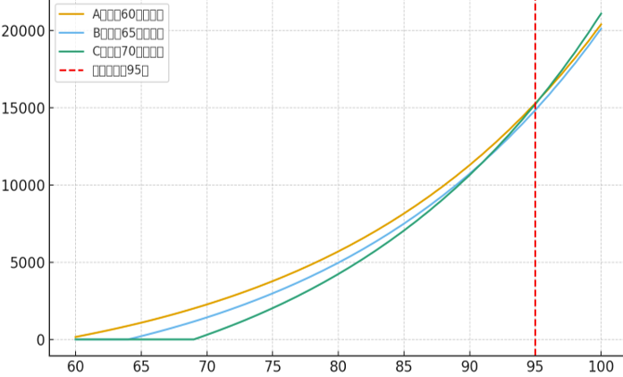 試しに65歳:200万円の受給を前提として、Aさん(60歳繰り上げ5%運用)、Bさん(65歳開始し5%運用)、Cさん(70歳繰り下げし5%運用)をChatGPTにシミュレーションしてもらったところ、95歳まではAさん、95歳を超えるとCさんが有利になるようです。
