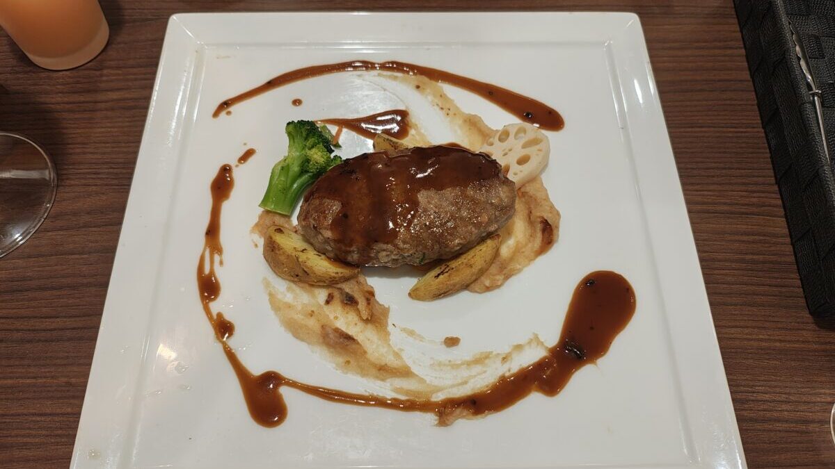 こちらはハンバーグステーキ。同じくトリュフソースが付いています。肉汁がたまらなく美味しい!