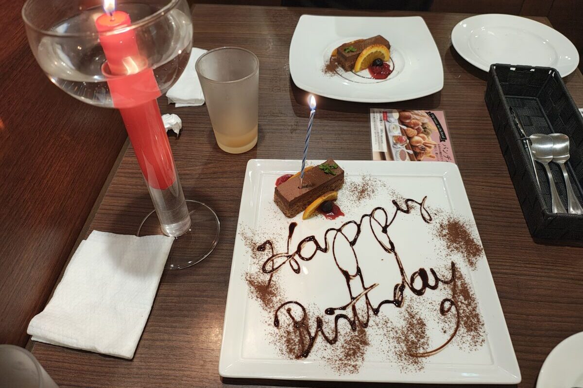 ラストは「ハッピーバースデー」と書かれたデザート(チョコムースブラウニー)です。