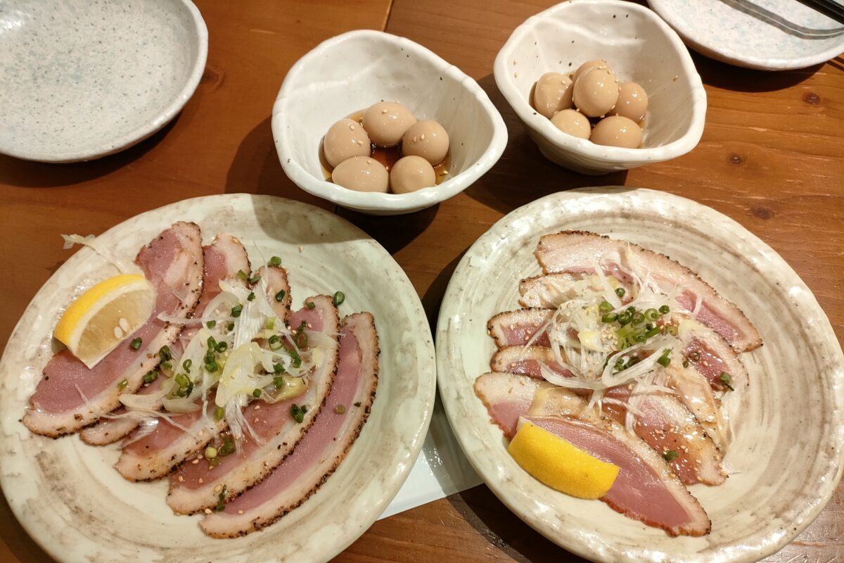 あわせて最初に頼むのが、「とりあえず」の中の『自家製味玉うずら』と『ねぎ塩鴨パッチョ』です。