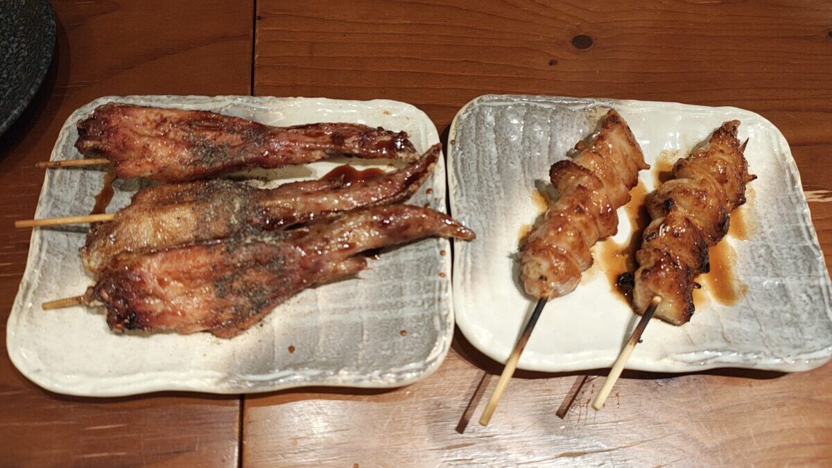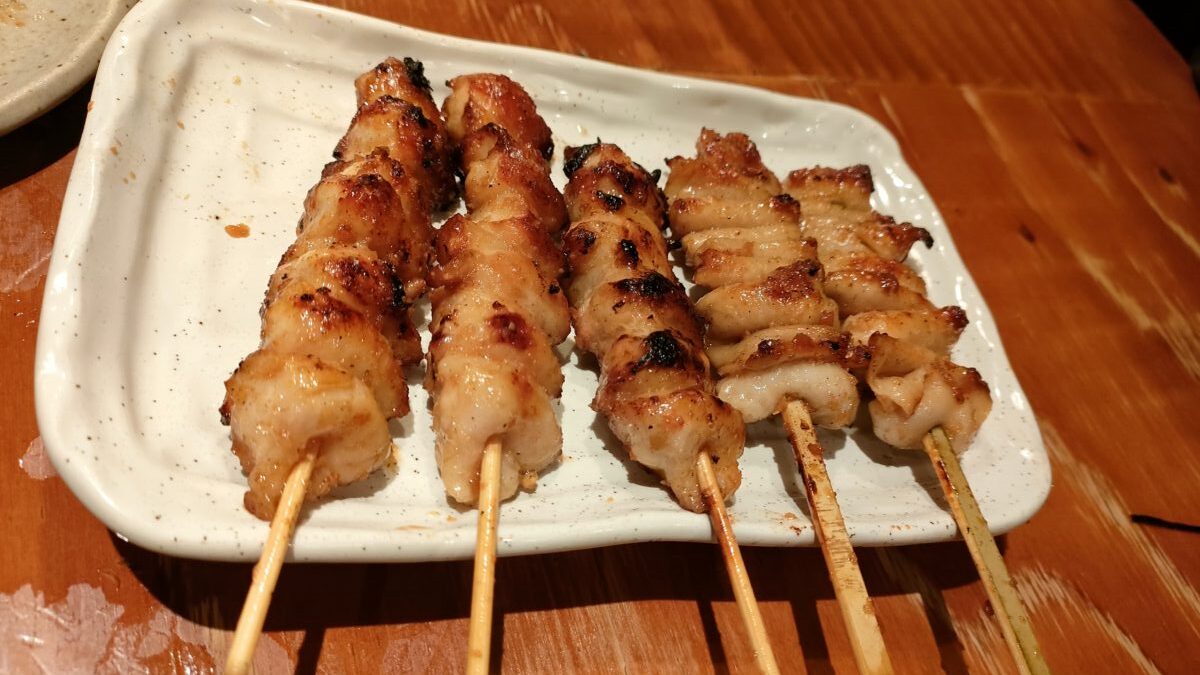 串料理も美味しいです。手羽先、鶏皮、ぼんじり、シロと注文しています。
