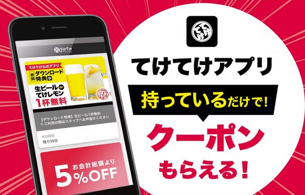 スマホアプリをインストールすると、『飲み物一杯無料券』や『5%OFF券』も配られます。ヘビーユーザーはインストール必須ですね!