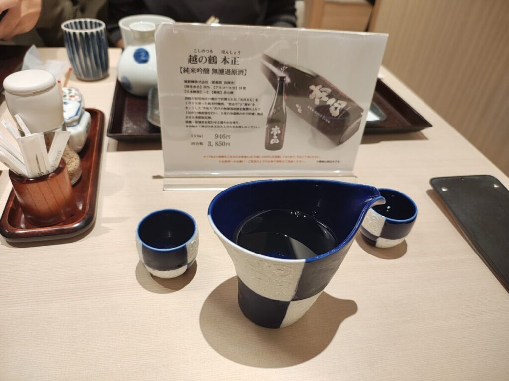 新潟といえば日本酒。久保田や越乃寒梅、八海山が有名ですが、今回はお店おススメの「越の鶴 本正」をチョイス。これも素晴らしい味わいでした。