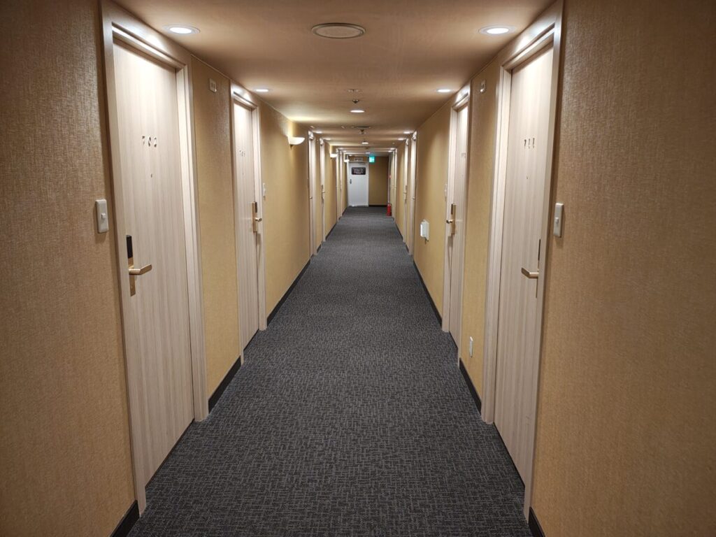 客室棟はリノベーションされており、廊下は明るめの色調です。扉は木目調で柔らかい雰囲気。