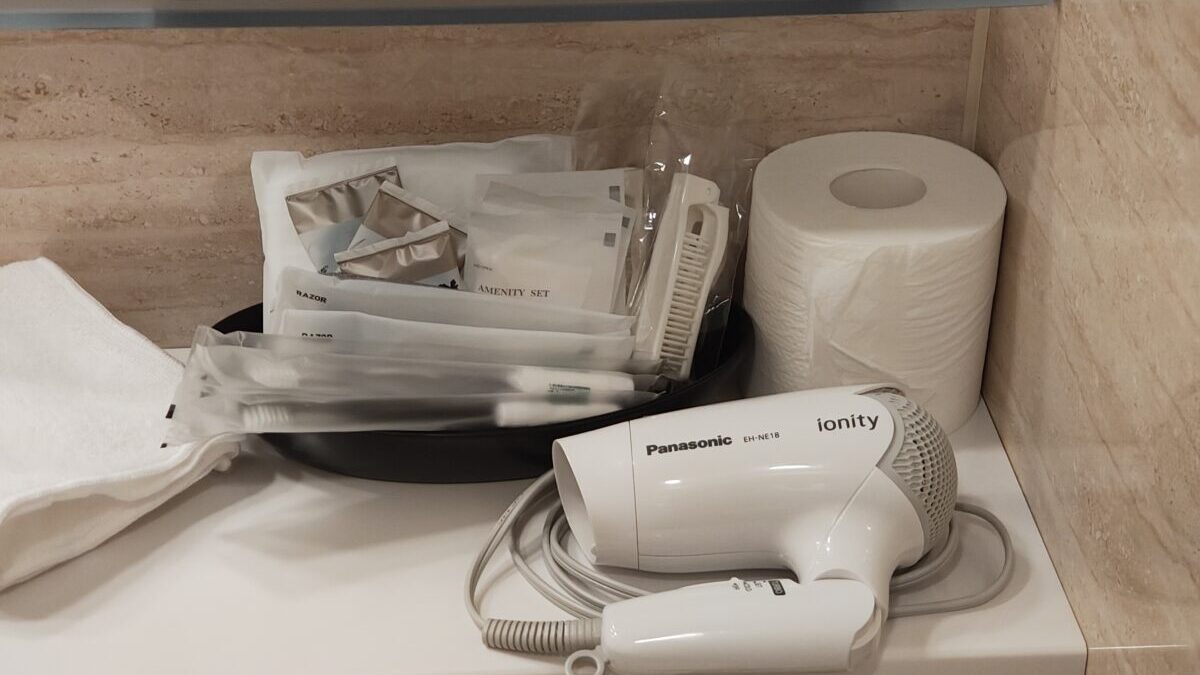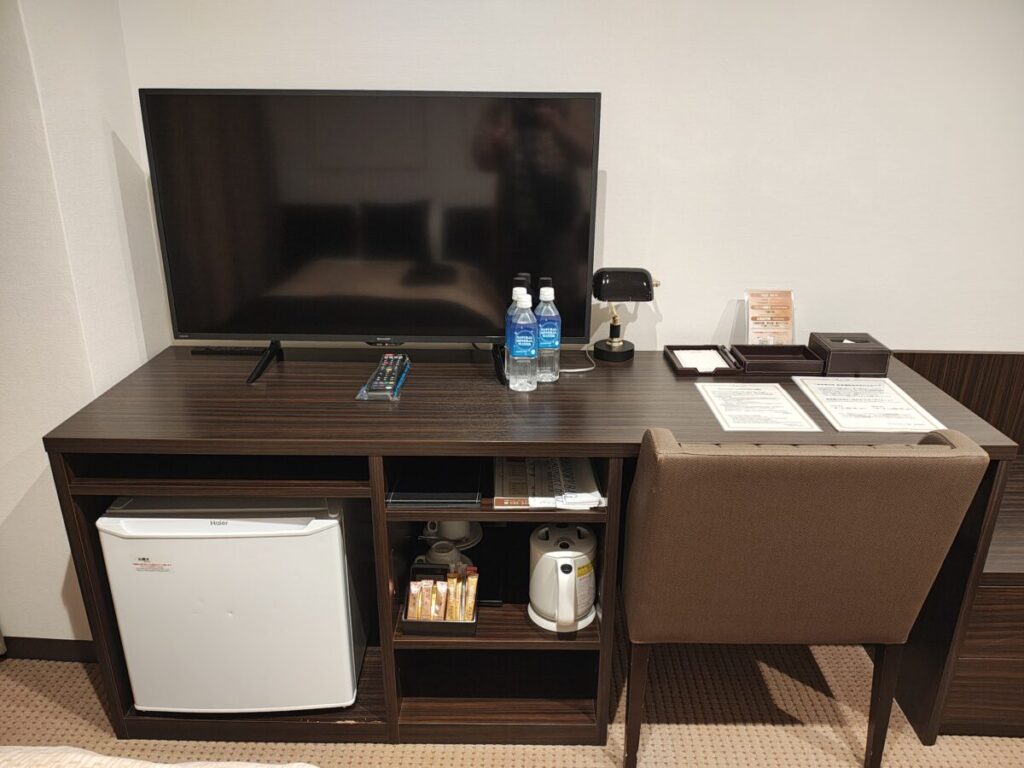 机はしっかりとしたサイズがあり、PC作業は問題なくできます。ただし室内Wi-Fiはちょっと弱めでした(部屋によるかもしれません)。ミネラルウォーターとインスタントコーヒー&お茶は人数分用意されています。