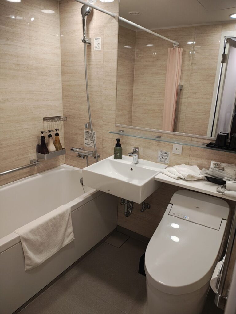 水回りはオーソドックスなシステムバス一体型のスタイル。リノベーション済で非常にキレイです。湯舟はビジネスホテルに比べて大きく、ゆったりと入れます。