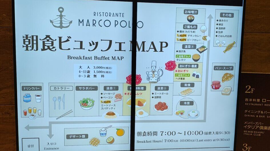 ・・・ということで、今回はめずらしく朝食付きプランを選択しました。1階のレストラン「マルコポーロ」でいただきます。