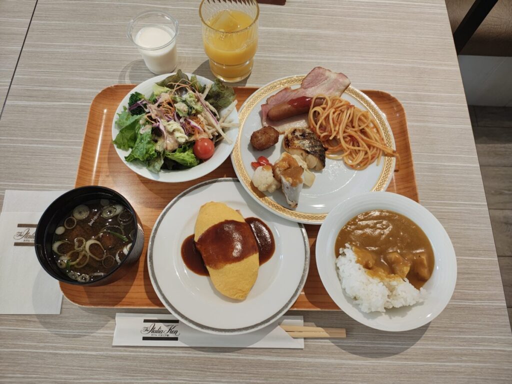 とりあえず1食目は伝統の味であるスパゲティ&チキンカレーと焼き立てオムレツを食べます。