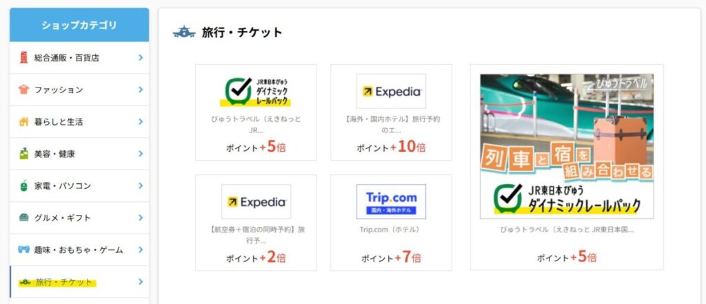 そこから、左ペインの「旅行・チケット」をクリックし、右ペインの「JR東日本びゅう ダイナミックレールパック」をクリックします。