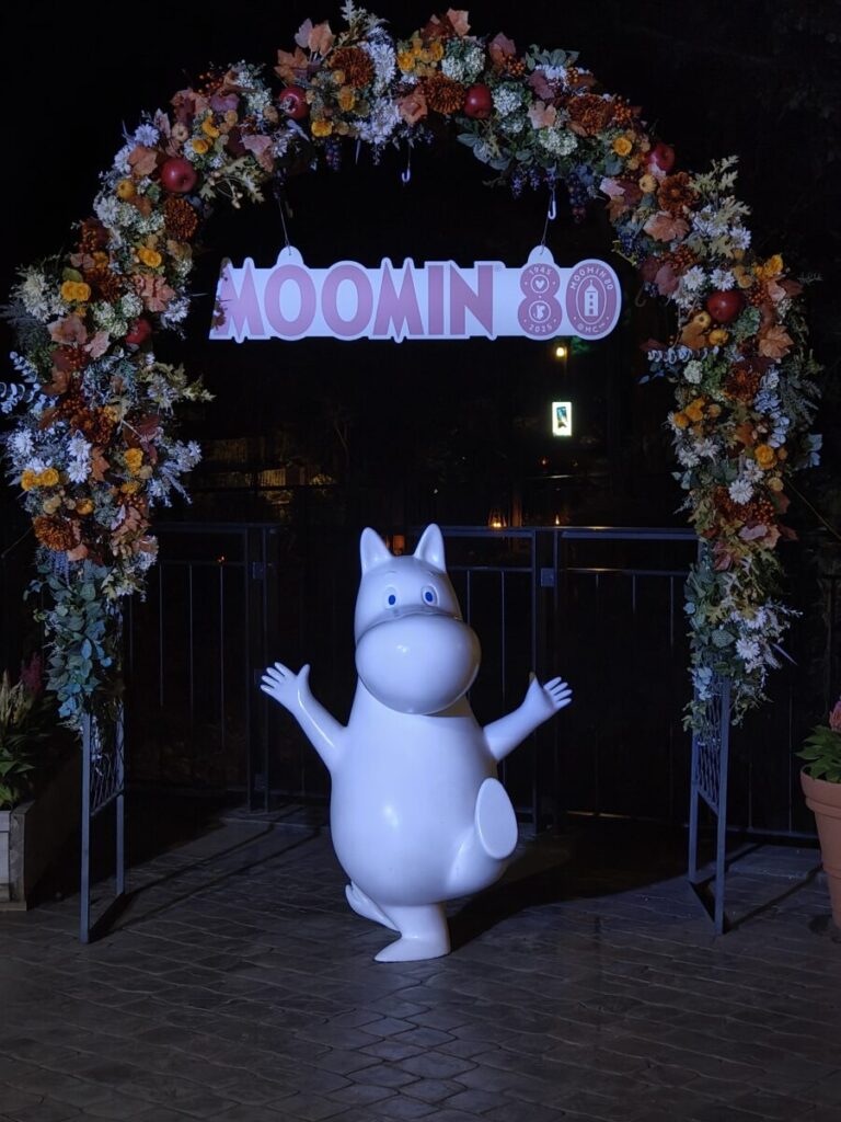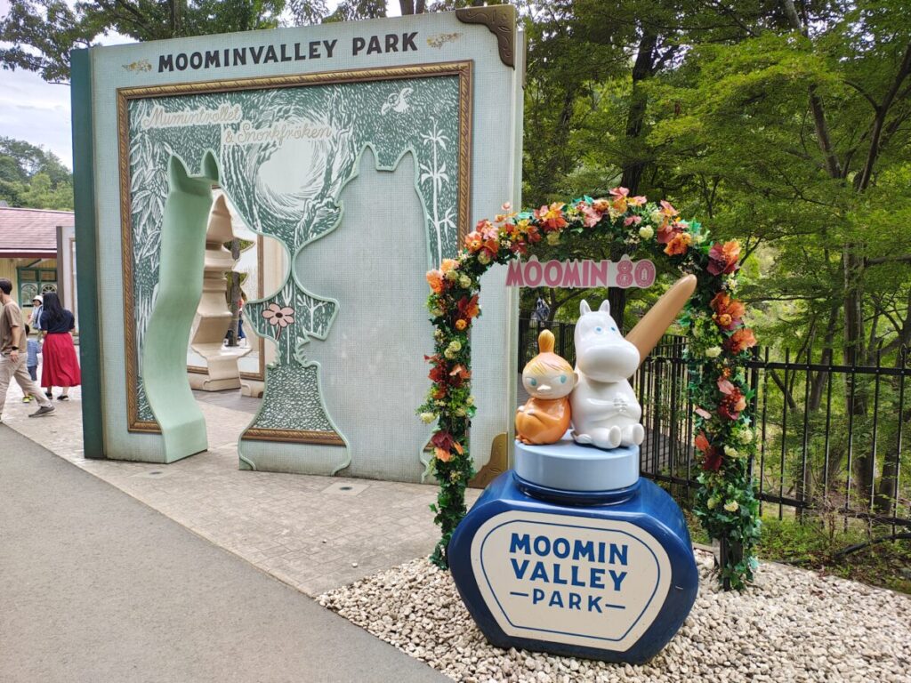 16時が近づいてきたのでムーミンバレーパークへ移動すると、「はじまりの入り江」エリアでムーミンとミィ&ウェルカムゲートがお出迎え。ちょうど80周年のタイミングでした。
