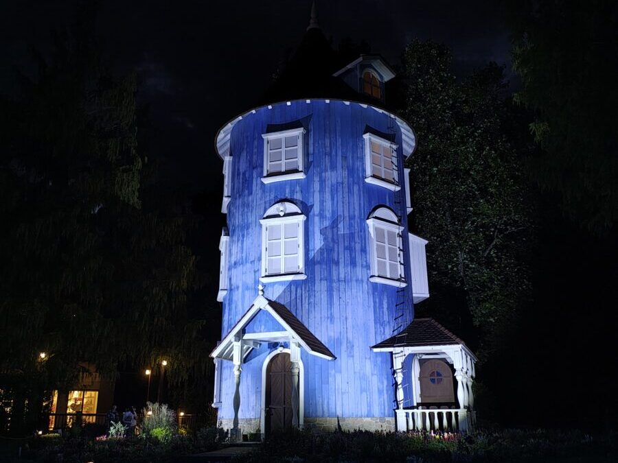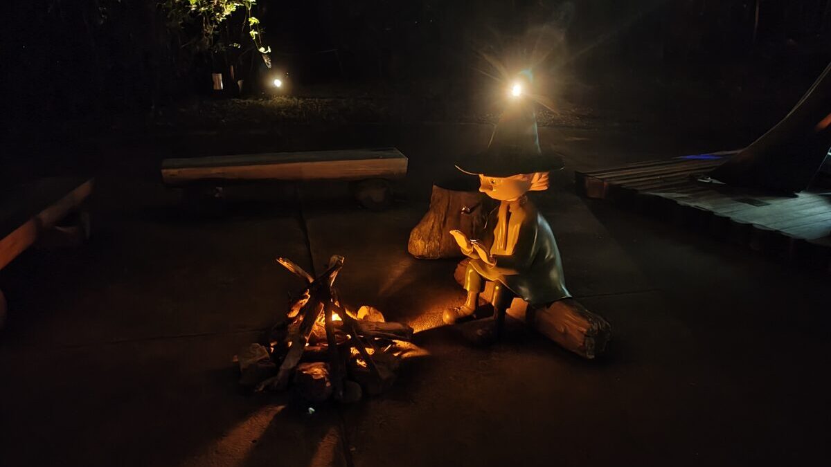 そしてムーミンとお別れ。昼はウェルカム感があるのですが、夜だとムーミンが何か(ぶたやま?)に驚いているように見えます。