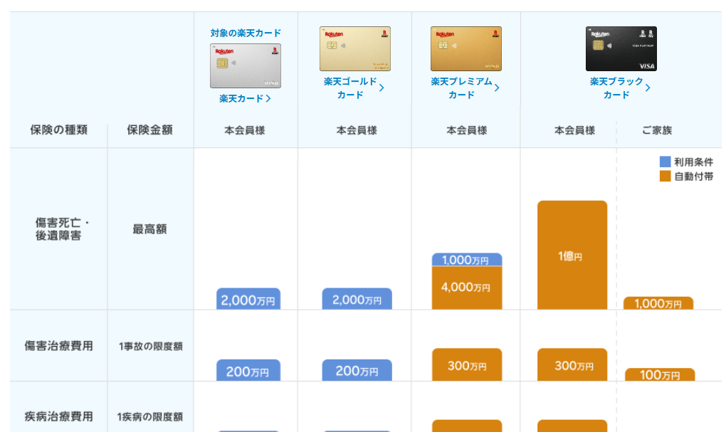 なんと利用条件なしで最高額が1億円まで保障されます。さすがは楽天最高のカード。