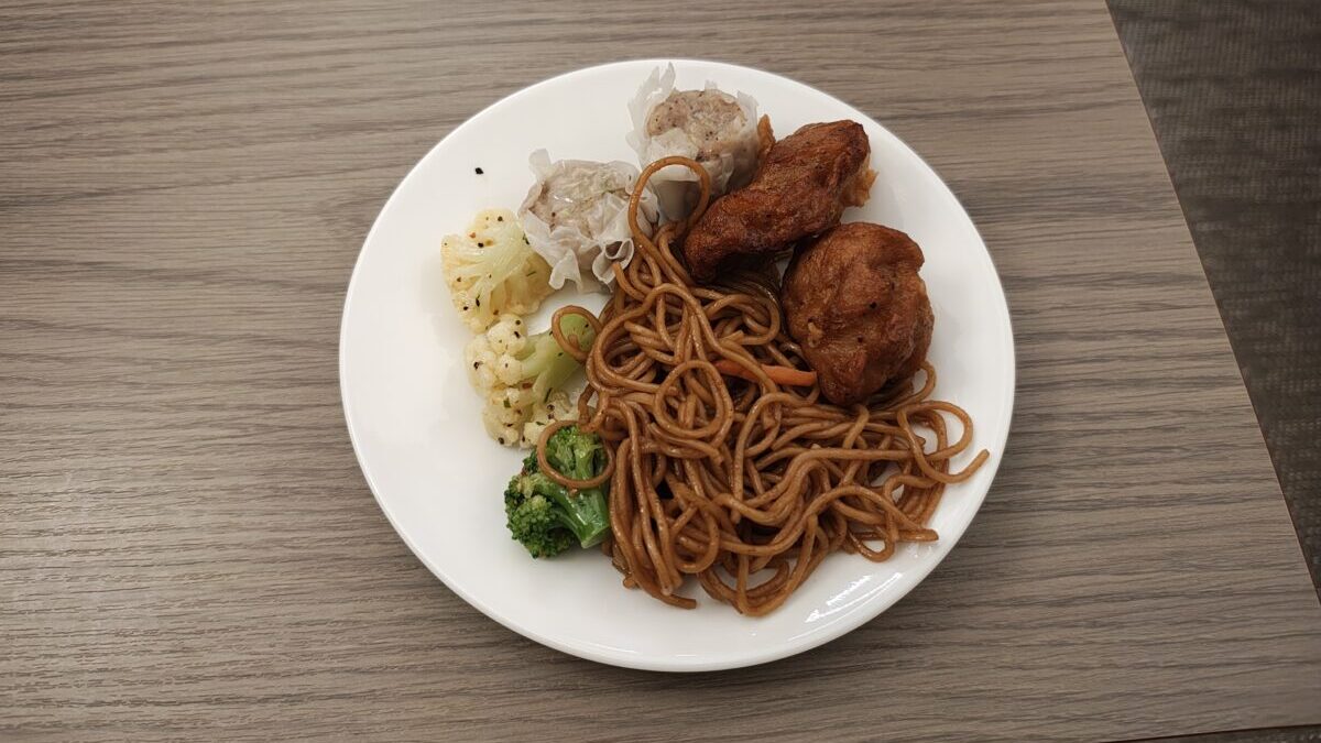 おかずゴロゴロ野菜 レモンペッパーソース、焼売、ソース焼きそば、鶏のから揚げ、枝豆