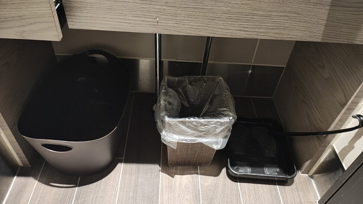 洗面台の下に「くつ入れ」、「ごみ箱」、「着物入れ」が用意されています。