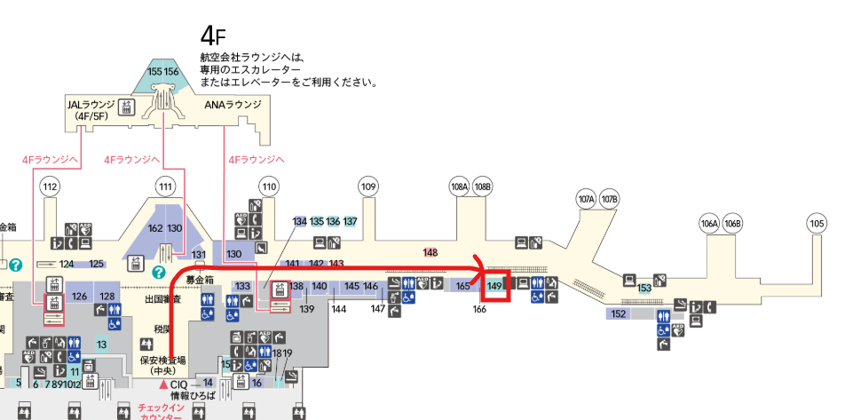 場所は「第3ターミナルの出発ロビーに入った後、右に曲がって歩きます。フロアマップ「149」(搭乗ゲート108あたり)にあります。