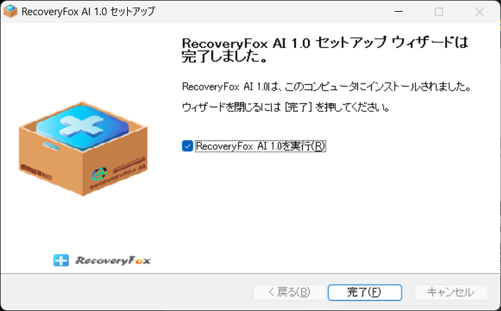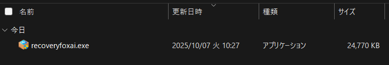 完了するとダウンロードフォルダに「recoveryfoxai.exe」がありますで、ダブルクリックします。