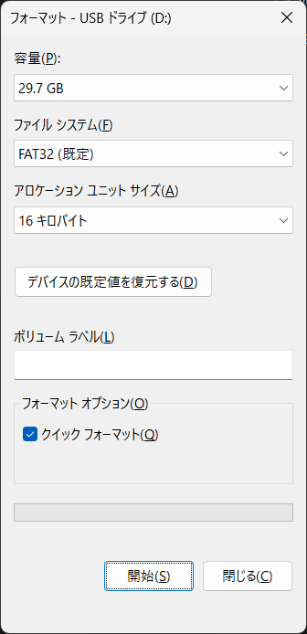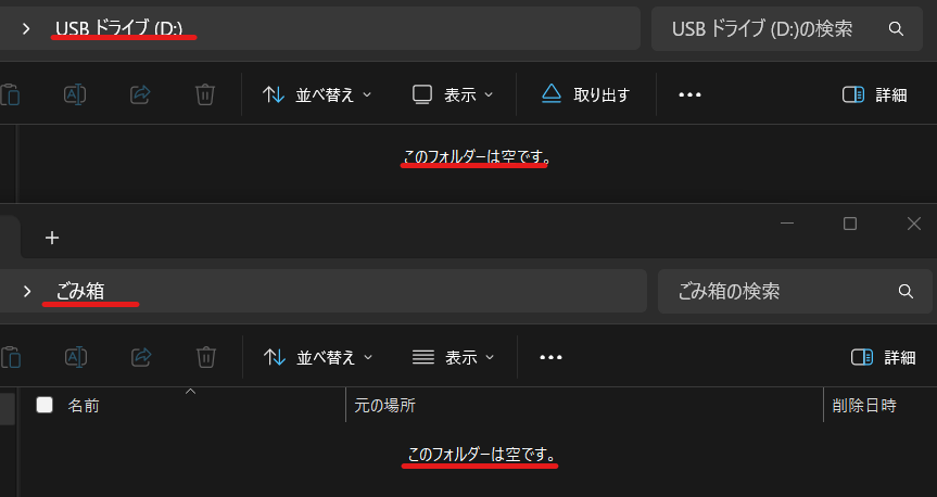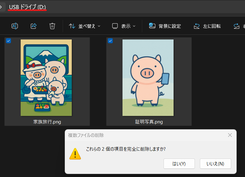 今回はUSBドライブ(Dドライブ)に入っているぶたやま家の写真を「削除」→「ごみ箱を空にする」、さらに「フォーマット」しちゃいます!