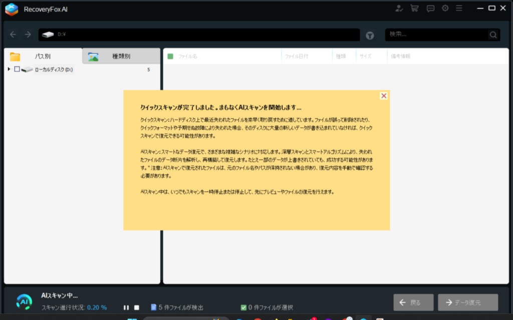 そしてRecoveryFox AIを起動し、対象のディスク(今回はDドライブ)を選択してスキャンします。