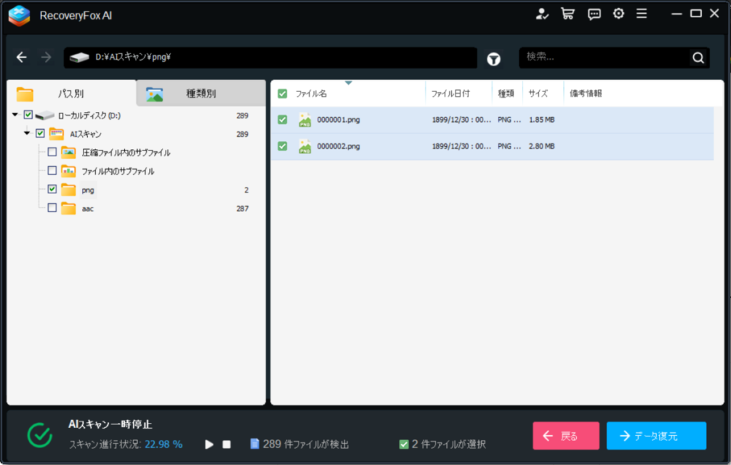 すぐにデータが見つかるようでしたら、画面左下の「AIスキャン中…」の停止ボタンを押下することで、データ復元フェーズに進めます。