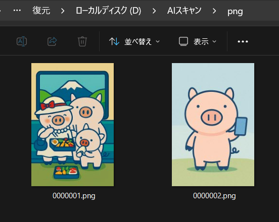 今回はすぐに削除した2件の画像ファイル(pngファイル)が見つかったので、これを選択して「データ復元」をクリックします。