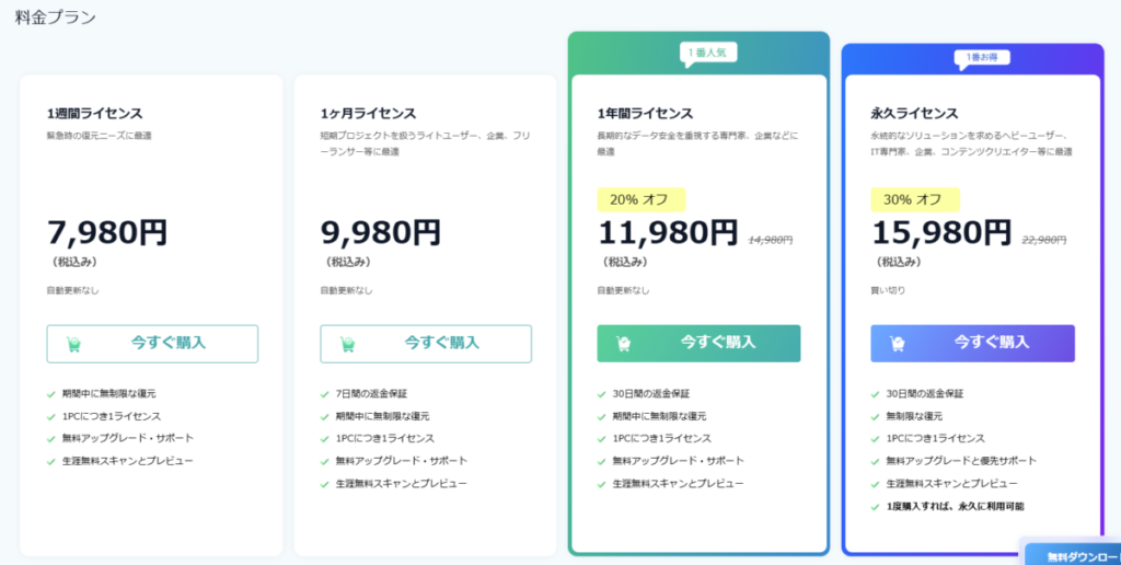 まずは無料インストールしてディスク検索を行い、目的のデータを見つけた場合はライセンス購入する